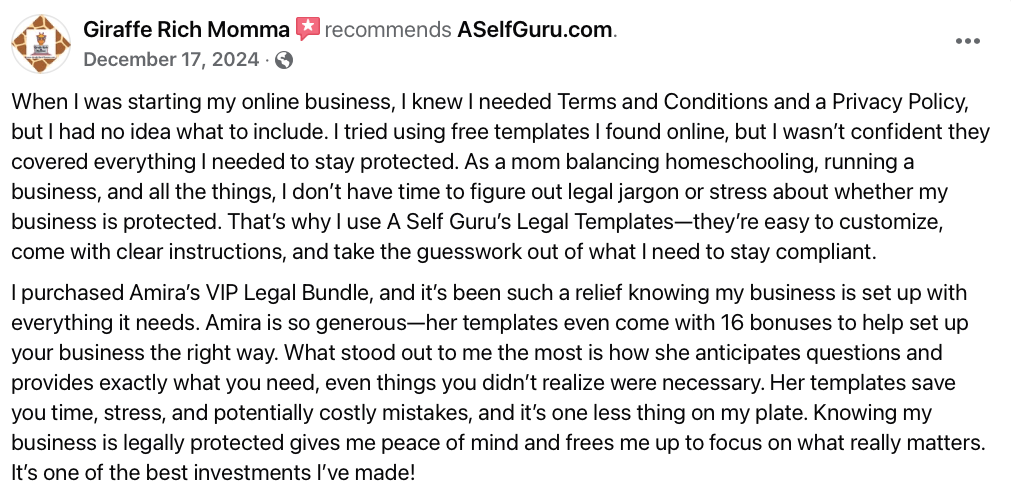 As a mom balancing homeschooling, running a business, and all the things, I don't have time to figure out legal jargon or stress about whether my business is protected. That's why I use A Self Guru's Legal Templates-they're easy to customize, come with clear instructions, and take the guesswork out of what I need to stay compliant. I purchased Amira's VIP Legal Bundle, and it's been such a relief knowing my business is set up with