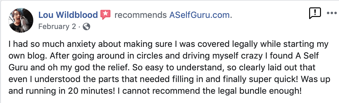 I had so much anxiety about making sure I was covered legally while starting my own blog. After going around in circles and driving myself crazy I found A Self Guru, and oh my god the relief. So easy to understand, so clearly laid out that even I understood the parts that needed filling in and finally super quick! Was up and running in 20 minutes! I cannot recommend the legal bundle enough!