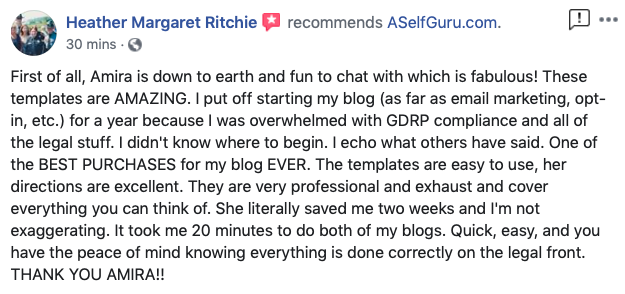 The Best Purchase I ever made for my blog! The professionalism and accuracy of the templates in the Legal Bundle is beyond what I truly thought possible. It took me just outside of 20 minutes to setup my legal pages. If you guys are on the fence about buying these templates I suggest you make the purchase. Seeing the price of some Lawyers selling legal documents I knew I had to go with Amira for my legal templates. Money well spent!