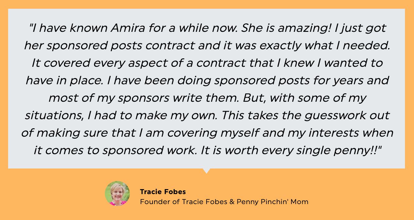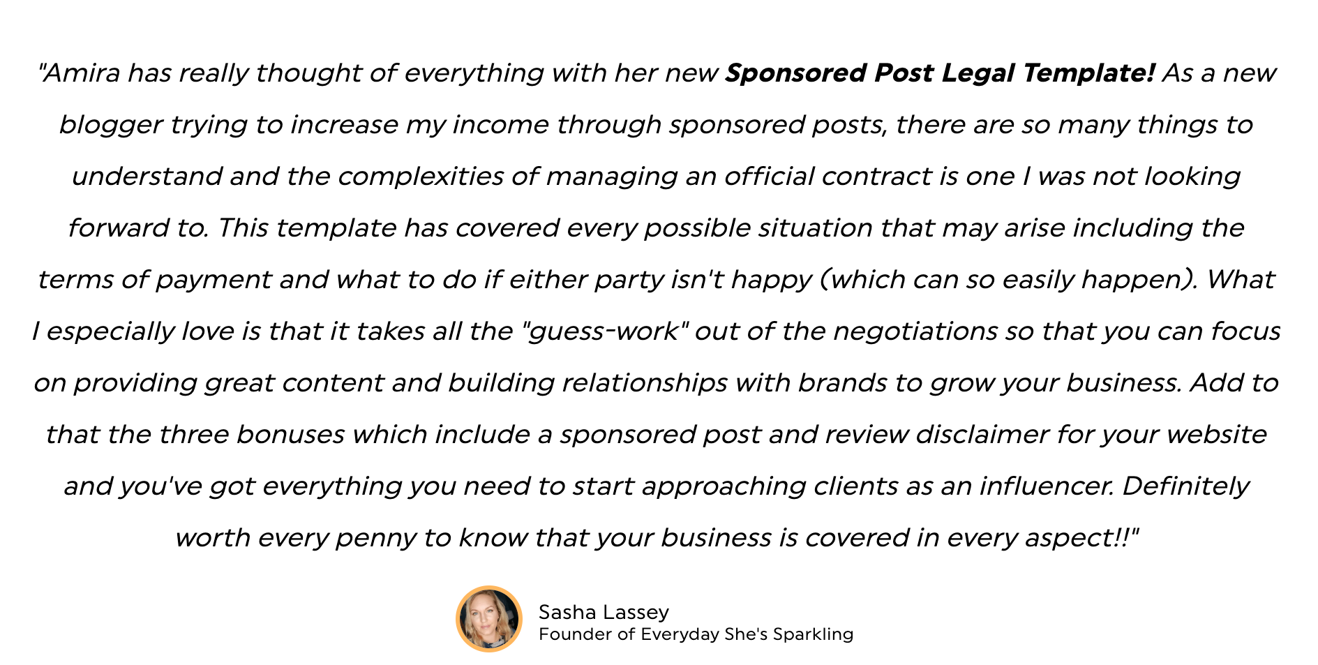 Steffa says, "I didn't want to be taken advantage of by the companies I was collaborating with and I needed to treat my blog like a business. Your Legal Bundle and Sponsored Posts contract template took away a lot of stress and that nagging feeling in the back of my mind that something bad was going to happen because I wasn't legally protected. After getting the templates, I could really focus on what else I needed to do to grow my blogging business. This contract template also helped me give a professional face to the companies I was working with!"
