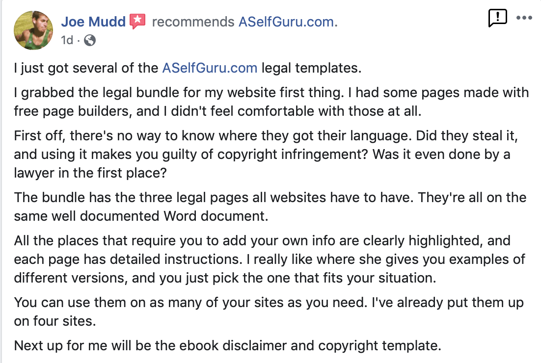 I grabbed the legal bundle for my website first thing. I had some pages made with free page builders, and I didn't feel comfortable with those at all. First off, there's no way to know where they got their language. Did they steal it, and using it makes you guilty of copyright infringement? Was it even done by a lawyer in the first place? The bundle has the three legal pages all websites have to have. You can use them on as many of your sites as you need. I've already put them up on four sites.