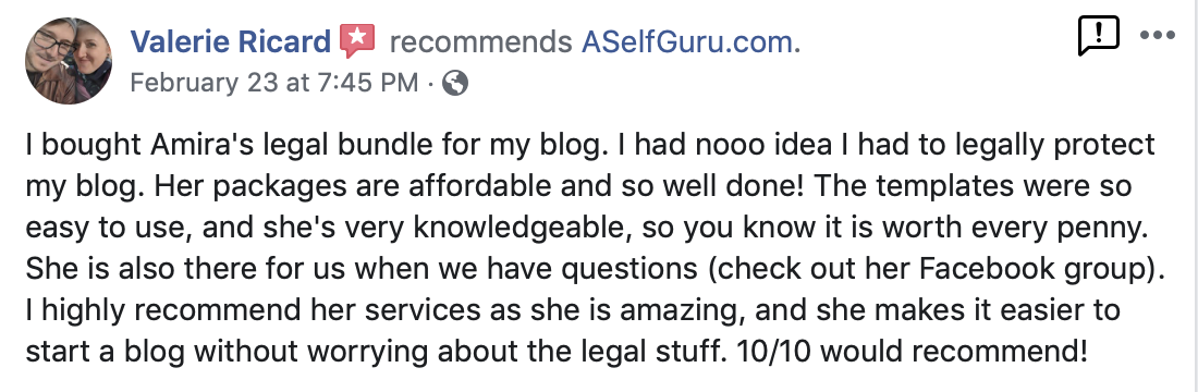 I bought Amira's legal bundle for my blog. I had no idea how to legally protect my blog. Her packages are affordable and so well done! The templates were so easy to use, and she's very knowledgeable, so you know it is worth every penny. She is also there for us when we have questions (check out her Facebook group). I highly recommend her services as she's amazing, and she makes it easier to start a blog without worrying about the legal stuff. 10/10 would recommend!