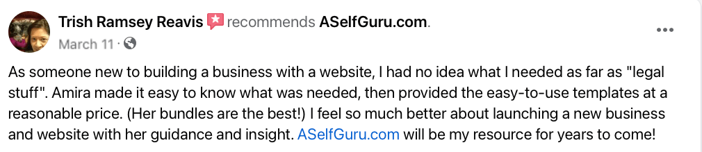 As someone new to building a business with a website, I had no idea what I needed as far as "legal stuff." Amira made it easy to know what was needed, then provided the easy-to-use templates at a reasonable price. Her bundles are the best! I feel so much better about launching a new business and website with her guidance and insight.