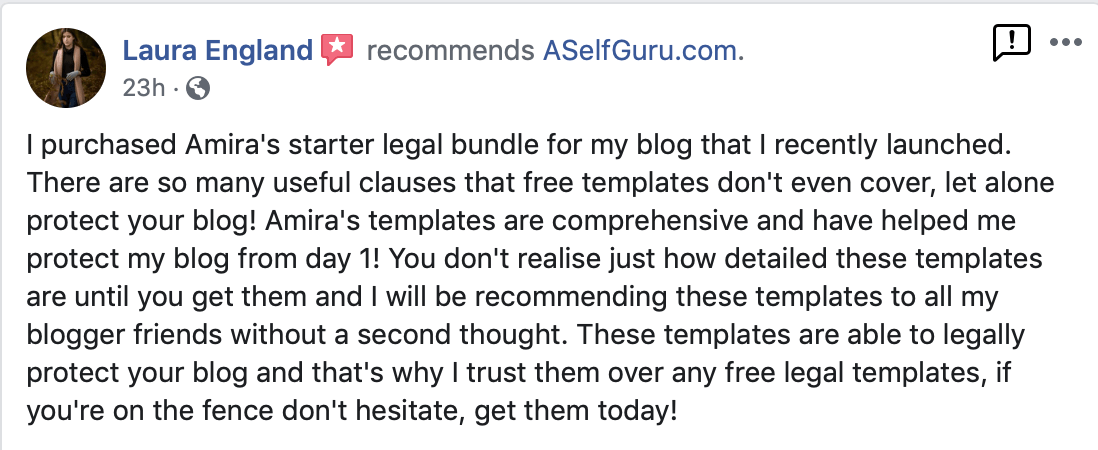 I purchased Amira's Starter legal bundle for my blog that I recently launched. There are so many useful clauses that free templates don't even cover, let alone protect your blog! Amira's templates are comprehensive and have helped me protect my blog from day 1! You don't realize just how detailed these templates are until you get them and I will be recommending these templates to all my blogger friends without a second thought. If you are on the fence, don't hesitate, get them today!