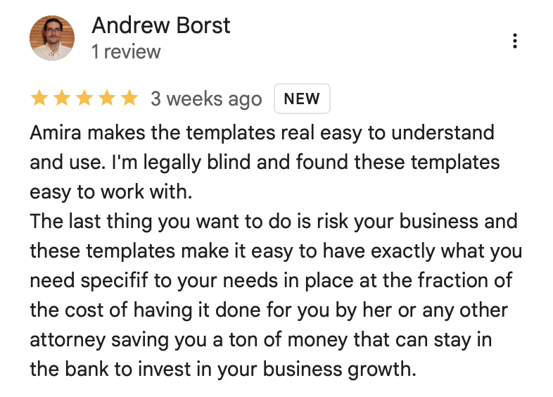 Amira makes the templates real easy to understand and use. I'm legally blind and found these templates easy to work with. The last thing you want to do is risk your business and these templates make it easy to have exactly what you need specific to your needs in place at a fraction of the cost of having it done for you by her or any other attorney saving you a ton of money that can stay in the bank to invest in your business growth.