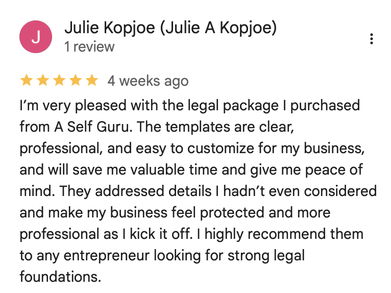 I'm very pleased with the legal package I purchased from A Self Guru. The templates are clear, professional, and easy to customize for my business, and will save me valuable time and give me peace of mind. They addressed details I hadn't even considered and made my business feel protected and more professional as I kick it off. I highly recommend them to any entrepreneur looking for strong legal foundations.