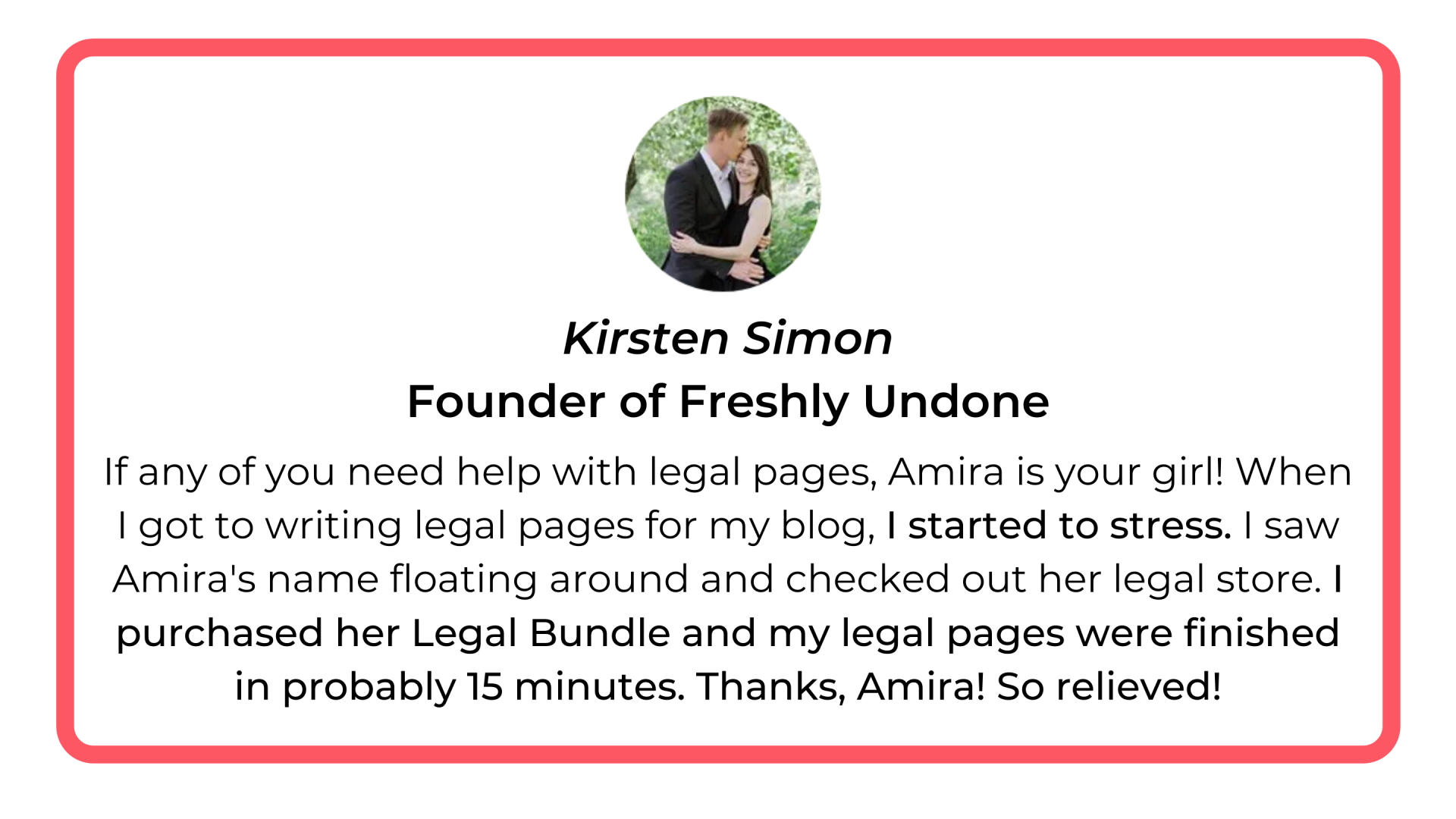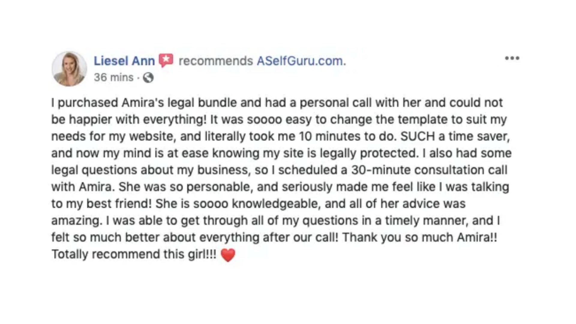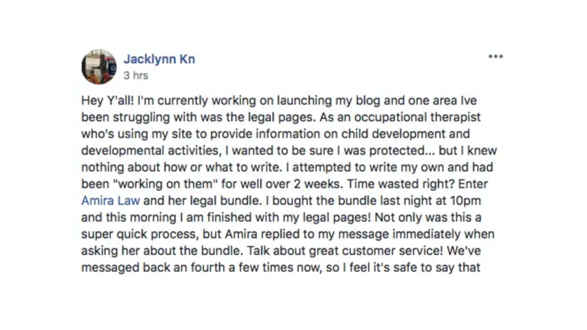 Amira helped us fix some of the verbiage in our legal pages! Thousands of our Create and Go students have purchased her legal templates and have loved them!