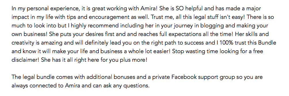 I am SO GLAD I decided to purchase Amira's legal templates! As a new blogger, it is difficult to decipher what is legit and what is false advertising. The Legal Bundle was EXACTLY as advertised! The documents were professionally written, and the instructions were super simple to follow.