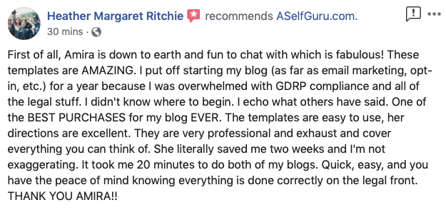 She says " I am just starting to put together my blog, and knowing I have something to help me cover the legal pages puts the confusion, guesswork and worries away.