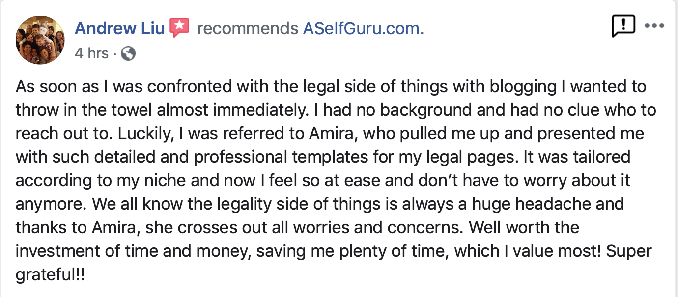 I have helped 30,000+ bloggers and entrepreneurs go from struggling to write legalese to feeling a huge sigh of relief and peace of mind in as little as less than 30 minutes.